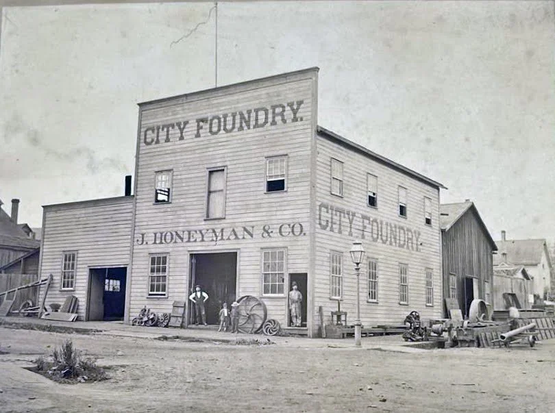 The large cast iron pilasters with lions on the capitals were cast at the Honeyman City Foundry in Portland Oregon. John Honeyman was a Scottish born immigrant that arrived in Portland in 1862.